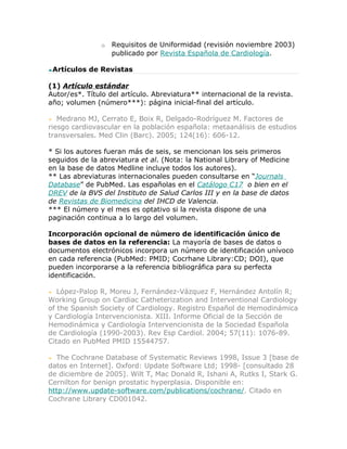 El Comité Internacional de Directores de Revistas Médicas (ICMJE) es un grupo informal que establece directrices de publicación para revistas biomédicas. El ICMJE no es una organización formal sino un grupo de editores que colaboran entre sí. El documento proporciona ejemplos de referencias bibliográficas traducidas al español de acuerdo con los requisitos de uniformidad establecidos por el ICMJE.