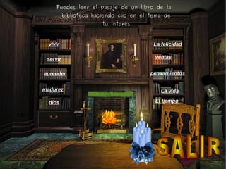 El resumen presenta una lista de temas de interés para leer pasajes de libros en la biblioteca haciendo clic en ellos. Los temas incluyen vivir, la felicidad, servir, aprender, madurez, la vida y el tiempo.