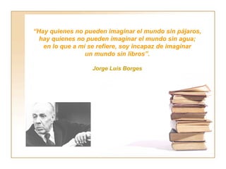 El documento describe la historia de los libros y bibliotecas a través de los tiempos, desde las primeras civilizaciones hasta la actualidad. Comienza con los primeros registros escritos en tablillas de arcilla en Mesopotamia, luego continúa con el desarrollo de soportes como el papiro, pergamino y papel. Menciona la invención de la imprenta y el aumento en la producción de libros. Finalmente, enfatiza la importancia de las bibliotecas escolares como recursos educativos y sugiere formas de incentivar