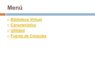 El documento describe una biblioteca virtual como una biblioteca digital donde una parte significativa de los recursos de información están disponibles en formato digital y accesibles a través de computadoras. Explica que las características de una biblioteca virtual incluyen que los documentos están disponibles cuando los usuarios los necesitan y responden dinámicamente a través de fuentes de información en red. Además, una biblioteca virtual mantiene las funciones de una colección sistematizada de documentos como un espacio compartido y refleja el dinamismo del internet.