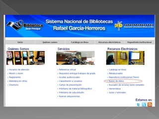 Este documento describe las diferentes bases de datos y recursos disponibles en la biblioteca virtual de la Universidad Minuto de Dios, incluyendo JSTOR, ProQuest, EBSCO, CABI, OVID, Wilson Web, Ebrary y MultiLegis. Explica brevemente cada una y cómo acceder a ellas, así como también menciona el catálogo en línea y enlaces de referencia.