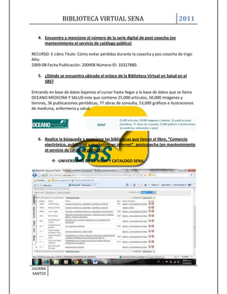 Este documento presenta la biblioteca virtual del SENA, con el objetivo general de difundir los recursos de información que ofrece para apoyar la formación profesional. Los objetivos específicos son que los aprendices reconozcan los recursos y servicios, y proveer retroalimentación. Se describen actividades para familiarizar a los aprendices con las bases de datos disponibles y estrategias para realizar búsquedas exitosas.