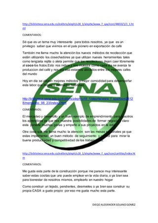 Los tres documentos tratan sobre temas relacionados con la agricultura en Colombia. El primero describe los nuevos métodos de recolección de café que permiten una mayor eficiencia y productividad. El segundo habla sobre las mesas sectoriales que implementan seguimiento y control de la productividad de los trabajadores. El tercero cubre información sobre técnicas de construcción básicas que pueden usarse en el hogar.