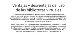 Las bibliotecas virtuales permiten acceder a recursos bibliotecarios desde fuera de la universidad mediante una clave de acceso. Para usar las bibliotecas virtuales desde un computador personal fuera de la universidad, los usuarios deben ingresar una clave asignada por el bibliotecario. No se requiere clave de acceso cuando se usan los computadores de la biblioteca o cuando se conecta dentro de las instalaciones de la universidad.