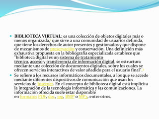 Una biblioteca digital es una colección de objetos digitales organizados que sirve a una comunidad de usuarios, tiene derechos de autor gestionados y mecanismos de preservación. Proporciona acceso a recursos documentales a través de Internet en formatos como PDF, doc, jpg. Las bibliotecas digitales ofrecen acceso las 24 horas desde cualquier lugar y cumplen normas como ISO sobre derechos de autor.
