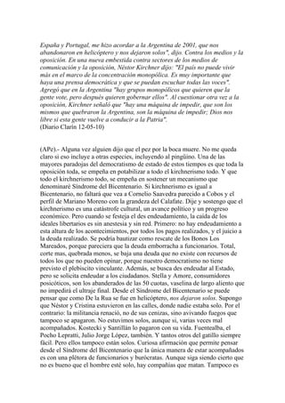 Este documento critica el llamado "Síndrome del Bicentenario" en el que se enmarcan las declaraciones de Néstor Kirchner. Señala que Kirchner afirmó que el gobierno de Cristina Fernández es el mejor de la historia de Argentina y vinculó la situación actual de Grecia con la crisis de 2001, aunque omitió mencionar otros problemas económicos y sociales del país. Finalmente, critica la idea de un pensamiento único promovido desde este síndrome y la censura de parte del himno nacional.
