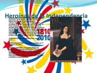 Heroínas de laIndependenciaGREGORIA POLICARPA SALVARRIETA RÍOS: Guaduas, 26 de enero de 1796. Virtuosa y digna heroína de la Independencia. “Joven, bonita, pobre, viva e inteligente”. Fusilada el 14 de noviembre de 1817, a las 10 de la mañana, en compañía de su novio el capitán Alejo Sabarain. Seis balas atravesaron su hermoso cuerpo y nueve vidas más fueron segadas ese mismo día en su compañía. Fue sepultada a petición de sus dos hermanos sacerdotes, José Ignacio y José María bajo en el altar mayor de la Iglesia de San Agustín.JUSTA ESTEPA: fusilada el 16 de enero de 1817.ANSELMA LEYTON: de Lérida. Fusilada el 17 de enero de 1817.CACICA GAITANA: el español Pedro de Añasco hizo inmolar quemando vivo al hijo de la Gaitana delante de la madre. La Gaitana destrozada por el dolor y la ferocidad de Añasco, reunió más de seis mil indígenas e hizo prisionero a Añazco tratándolo con gran crueldad e insensibilidad.