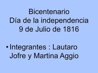 El documento resume aspectos de la vida en Buenos Aires en 1816, el año de la independencia de Argentina. Describe las características de las edificaciones coloniales, las costumbres sociales como las tertulias y reuniones en patios, la vestimenta formal de la época, los estilos musicales populares como el tango, minué y folklore, y la composición de la Primera Junta de Gobierno que gobernó tras la independencia.