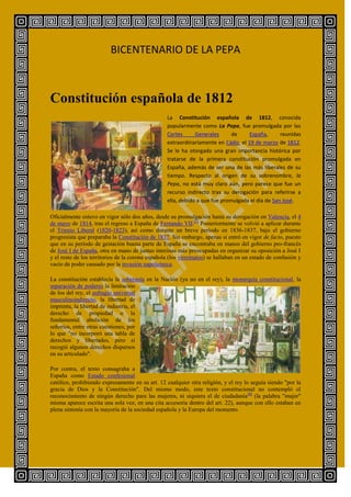 La Constitución española de 1812, conocida como La Pepa, fue la primera constitución promulgada en España y una de las más liberales de su tiempo, estableciendo la soberanía en la nación, la monarquía constitucional y la separación de poderes. Aunque estuvo oficialmente en vigor solo dos años, también se aplicó durante el Trienio Liberal y brevemente en 1836-1837. Reconoció derechos como la libertad de imprenta y propiedad, pero mantuvo a España como estado católico y no contempló derechos