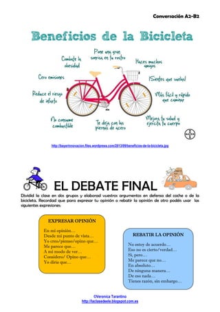 El documento presenta una guía para realizar un debate en clase sobre las ventajas y desventajas de usar la bicicleta versus el coche en la ciudad. Incluye preguntas de introducción y actividades de preparación, así como expresiones útiles para argumentar y rebatir opiniones durante el debate. Se fomenta la reflexión personal sobre medios de transporte y se organiza a los estudiantes en grupos para defender sus posiciones.