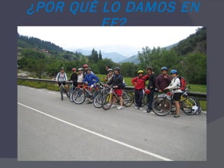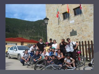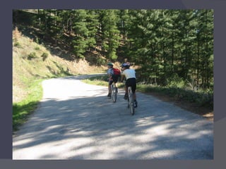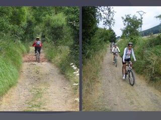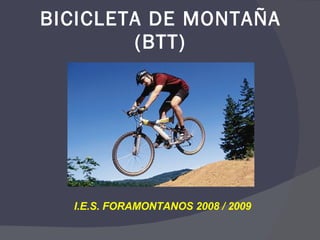 El documento proporciona información sobre el uso de bicicletas de montaña, incluyendo consejos sobre la talla adecuada, equipamiento necesario, normas de circulación, técnica de conducción, mecánica básica y rutas comunes. Explica cómo seleccionar la talla correcta de bicicleta, los elementos obligatorios como el casco, y las señales de tráfico principales. También describe cómo cambiar los desarrollos, revisar la presión de las ruedas y solucionar pinchazos.