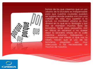 La bicicleta plegable permite plegarla a un tamaño reducido para transportarla fácilmente en el transporte público, automóviles y otros lugares, lo que la hace muy adecuada para usar en ciudades. Está disponible en varios diseños y colores. Algunas ventajas clave son que se puede llevar a cualquier parte, usarla para evitar robos, y combinarla con otros medios de transporte para ir al trabajo.