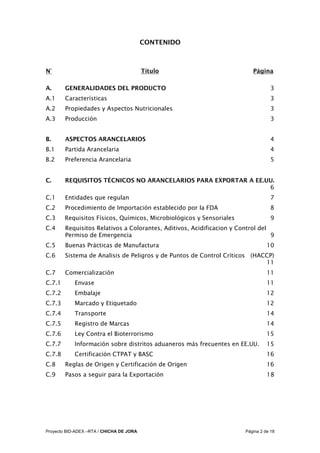 Este documento describe los requisitos técnicos y arancelarios para exportar chicha de jora a los Estados Unidos. Explica que la chicha de jora tiene una partida arancelaria 2206.00.90 en ambos países y que, bajo el TLC Perú-EEUU, está libre de aranceles. También detalla los organismos regulatorios en EE.UU., los permisos necesarios, y los requisitos de envase, etiquetado y transporte.
