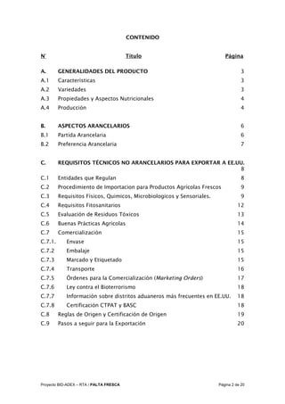 Este documento proporciona información general sobre la palta fresca. Describe las características, variedades, propiedades nutricionales, producción, aspectos arancelarios y requisitos para exportar paltas frescas a EE.UU. Las variedades más comunes para exportación son Fuerte y Hass. El TLC entre Perú y EE.UU. establece un arancel preferencial del 11.2 centavos de dólar por kilo para paltas frescas exportadas entre febrero y septiembre.