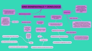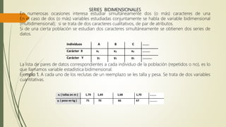 Este documento describe series bidimensionales y series cronológicas. Explica que una serie bidimensional estudia dos o más características de una población simultáneamente, como la talla y peso de reclutas. Una serie cronológica ordena observaciones de una variable a lo largo del tiempo. Componentes clave de una serie temporal incluyen tendencia, variaciones estacionales, cíclicas y residuales.