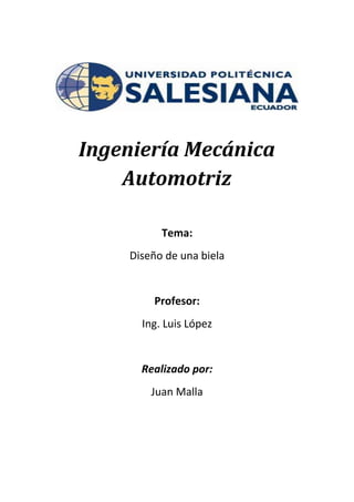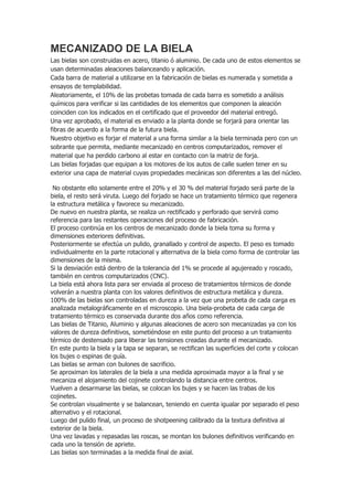 El documento describe el proceso de fabricación de bielas para motores de automóviles. El proceso comienza con la selección del material, que puede ser acero, titanio o aluminio. Luego, el material se forja para darle forma similar a la biela final y se somete a mecanizado para quitar el exceso de material. Finalmente, el proceso incluye varias etapas de mecanizado, tratamientos térmicos, control dimensional y de calidad para producir la biela con las especificaciones requeridas.