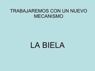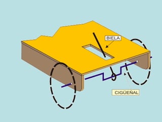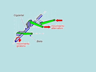 Este documento describe dos componentes mecánicos clave, la biela y el cigüeñal. La biela convierte un movimiento circular en uno rectilíneo alternativo, y viceversa, mientras que el cigüeñal convierte un movimiento circular en uno rectilíneo. El documento analizará estos mecanismos y cómo trabajan juntos.