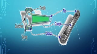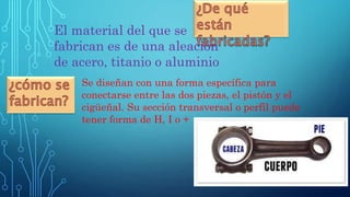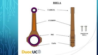 La biela es un elemento mecánico que transmite el movimiento entre el pistón y el cigüeñal en un motor de combustión interna, convirtiendo el movimiento rotatorio del cigüeñal en lineal alternativo del pistón y viceversa. Se fabrican generalmente de aleaciones de acero o aluminio y su función principal es transmitir la fuerza del pistón al cigüeñal durante el ciclo de funcionamiento del motor.