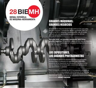 La 27a edición de la BIEMH tuvo éxito con más de 34,000 visitantes de 56 países, destacando la innovación como eje principal. La feria se consolida como una plataforma para oportunidades de negocio en el sector de la máquina herramienta, con una próxima cita programada del 2 al 7 de junio de 2014. Se implementarán acciones para apoyar a los expositores en la promoción y comercialización internacional de sus productos.