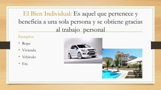 Este documento resume la diferencia entre el bien individual y el bien común. Explica que el bien individual beneficia a una sola persona a través de su trabajo personal y da ejemplos como la ropa y el vehículo. Mientras que el bien común beneficia a toda una comunidad a través de servicios como la reparación de tuberías o el aseo de la ciudad. También define la propiedad intelectual y los derechos de autor y propiedad industrial. Finalmente, describe los servicios públicos y su regulación por el estado para proveerlos de manera adecuada y a bajo prec
