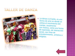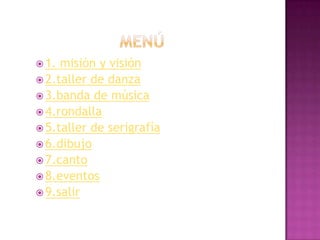 El documento describe varias actividades y talleres que una organización ofrece, incluyendo danza, música (banda y rondalla), serigrafía, dibujo y canto. También menciona la misión y visión de la organización, y algunos eventos que realizan.