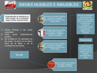 Este documento describe la clasificación de bienes muebles e inmuebles según la ley venezolana. Explica que los bienes inmuebles incluyen terrenos, edificios, construcciones y derechos sobre bienes inmuebles. Los bienes muebles son aquellos que pueden moverse por sí mismos o ser movidos, así como también los derechos y acciones patrimoniales que no sean sobre bienes inmuebles. Finalmente, señala que los derechos de propiedad industrial, autor y crédito son considerados bienes