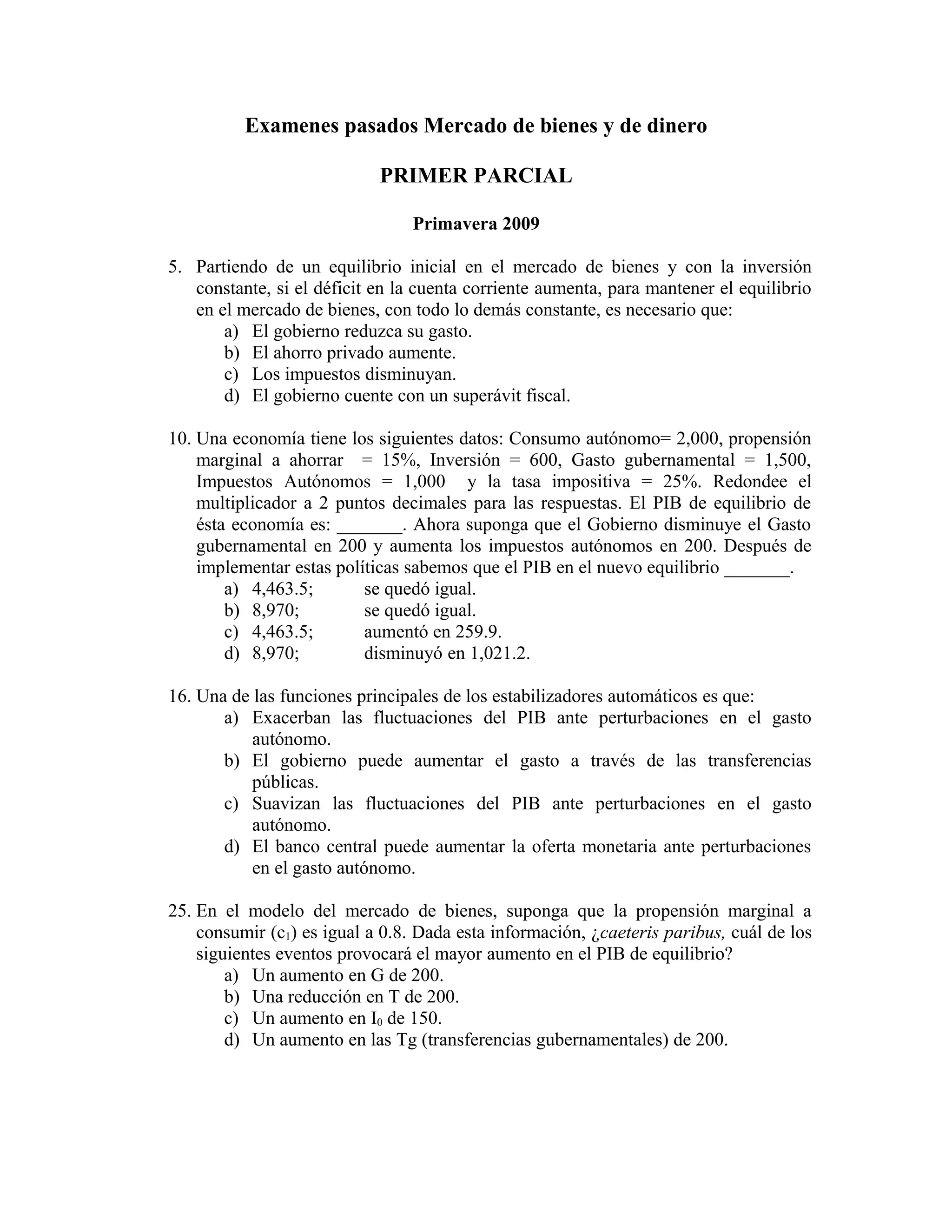 Este documento contiene preguntas y respuestas de exámenes de economía sobre temas como el mercado de bienes y dinero, multiplicadores keynesianos, funciones de consumo e inversión, efectos de cambios en impuestos y gasto del gobierno, y tasas de interés de bonos. Las preguntas abarcan conceptos como equilibrio en el mercado de bienes, cálculo de PIB de equilibrio, función de los estabilizadores automáticos, y efectos de cambios en variables como propensión al consumo e inversión autón