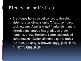 La OMS definió la salud en 1946 como un estado completo de bienestar físico, mental y social, más que la mera ausencia de enfermedad. El enfoque holístico considera las dimensiones físicas, mentales, sociales, emocionales y espirituales del ser humano de manera interdependiente. La salud holística busca alcanzar una óptima calidad de vida a través de comportamientos que aseguren una vida saludable considerando al ser humano como una unidad integrada.