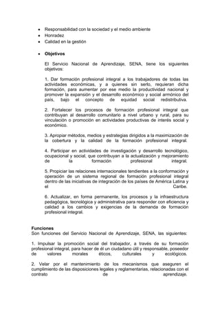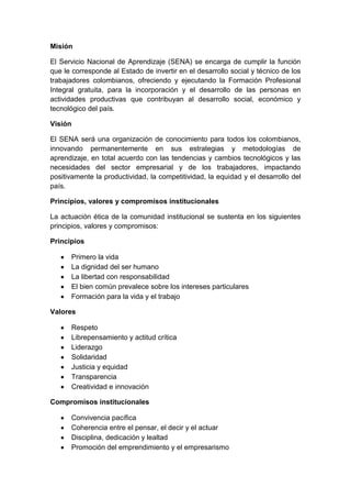 El Servicio Nacional de Aprendizaje (SENA) es una organización del Estado colombiano encargada de ofrecer formación profesional gratuita a los trabajadores para contribuir al desarrollo social y económico del país. Su misión es invertir en el desarrollo de los trabajadores colombianos a través de programas de formación que permitan su incorporación a actividades productivas. El SENA también busca innovar constantemente en sus estrategias de aprendizaje de acuerdo con las necesidades del sector empresarial y los cambios tecn