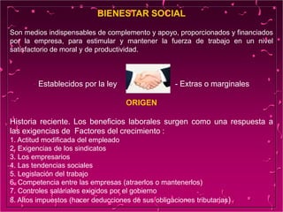El documento describe los beneficios sociales y de bienestar laboral que las empresas ofrecen a sus empleados. Explica que estos beneficios surgen para mejorar la moral y productividad de los trabajadores y atraer y retener el talento. Incluye beneficios monetarios como primas y no monetarios como servicios médicos. El objetivo es satisfacer las necesidades de los empleados dentro y fuera del trabajo para mejorar su calidad de vida y la de sus familias.