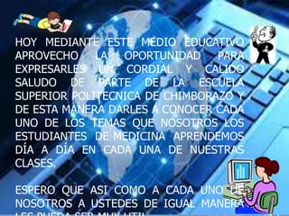 El documento da la bienvenida a los lectores en nombre de la Escuela Superior Politécnica de Chimborazo y ofrece informar sobre los temas que los estudiantes de medicina aprenden en clase diariamente. El objetivo es dar a conocer la funcionalidad de las herramientas de Microsoft Word y Excel y ampliar los conocimientos sobre estos programas.
