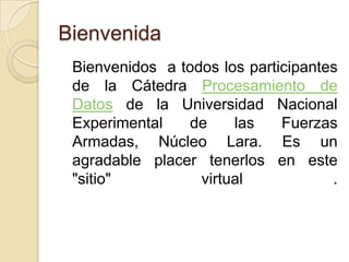 La profesora Silva da la bienvenida a los estudiantes de la Cátedra Procesamiento de Datos de la Universidad Nacional Experimental de las Fuerzas Armadas, Núcleo Lara a su foro virtual. Ella cree que el foro será beneficioso tanto para los estudiantes como para ella, y que todos tendrán la oportunidad de aprender más sobre la asignatura. Ella les recuerda a los estudiantes que lean todo el material disponible y que pueden comunicarse con ella o sus compañeros en el chat o en la sección de Ayudas y Ayudadores si tienen