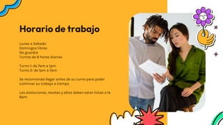 Este documento presenta el horario, servicios a cubrir, uniforme y reglas generales para la rotación de ginecología y obstetricia de octubre de 2023. Los turnos son de lunes a sábado de 6 horas cada uno, de 7am a 1pm o de 1pm a 7pm. Se detallan los procedimientos requeridos para los paquetes de legrado, cesárea y parto.