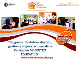 Este documento describe un programa de autoevaluación y mejora continua de la calidad en centros educativos. El programa consta de un curso de especialización de 8 meses y un portal web permanente. El curso busca desarrollar competencias para la autoevaluación y mejora de estándares de calidad, mientras que el portal ofrece herramientas de gestión y reconocimiento por logros alcanzados.