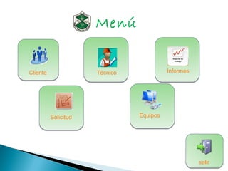 Este documento presenta la interfaz de un sistema de gestión de solicitudes técnicas con secciones para clientes, técnicos, equipos, solicitudes y detalles de solicitudes. Permite crear, editar y eliminar registros asociados a cada sección.