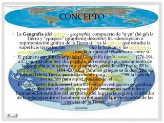La geografía estudia la superficie terrestre y las sociedades que la habitan. Se originó en Grecia cuando los primeros geógrafos comenzaron a estudiar y describir sistemáticamente la Tierra. Actualmente se divide en geografía física, que estudia el medio físico, y geografía humana, que estudia las interacciones entre los seres humanos y su entorno. También incluye geografía regional, que analiza sistemas territoriales particulares.