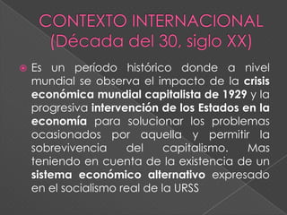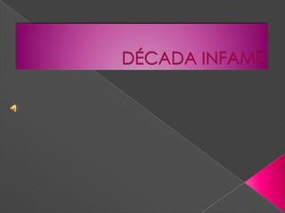 El documento describe la década de 1930 en Argentina. Fue un período caracterizado por (1) la caída de la economía agroexportadora debido a la crisis mundial y el surgimiento de la industrialización, (2) el debilitamiento del gobierno democrático de Yrigoyen y el primer golpe de Estado militar en 1930 que puso fin al proceso democrático iniciado en 1916, y (3) la búsqueda de mantener el modelo económico agroexportador y el fraude electoral por parte de los nuevos gobernantes militares.