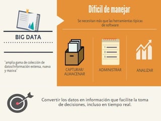 Este documento define el Big Data y discute sus cinco características (volumen, variedad, velocidad, veracidad y valor). Explica que los datos masivos son generados por personas, transacciones, redes sociales, máquinas y biométrica. El Big Data puede ser útil para obtener una visión de 360 grados del cliente, extender la seguridad e inteligencia y analizar operaciones. Sin embargo, también plantea preocupaciones sobre la privacidad y el uso malicioso de los datos por parte de los cibercriminales.