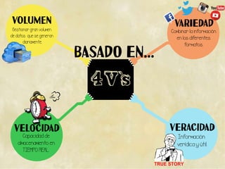 El documento presenta una recopilación de seis fuentes que definen y explican el concepto de Big Data, incluyendo artículos de 2015 de Quees.com, El Economista, Forbes México y el sitio bigdatalandscape.com, así como contenido de 2012 de IBM y de 2015 de AndrésRaya.com.