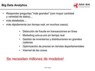 El documento aborda la automatización en el análisis de big data y la necesidad de agilizar el modelado predictivo para manejar grandes volúmenes de datos. Se discuten herramientas y tecnologías utilizadas en la automatización de modelos, así como el papel crucial del analista en la configuración y ajuste de estos modelos. También se identifican déficits en la automatización actual, como la necesidad de integrar diversas fuentes de datos y mejorar la sofisticación de los modelos utilizados.