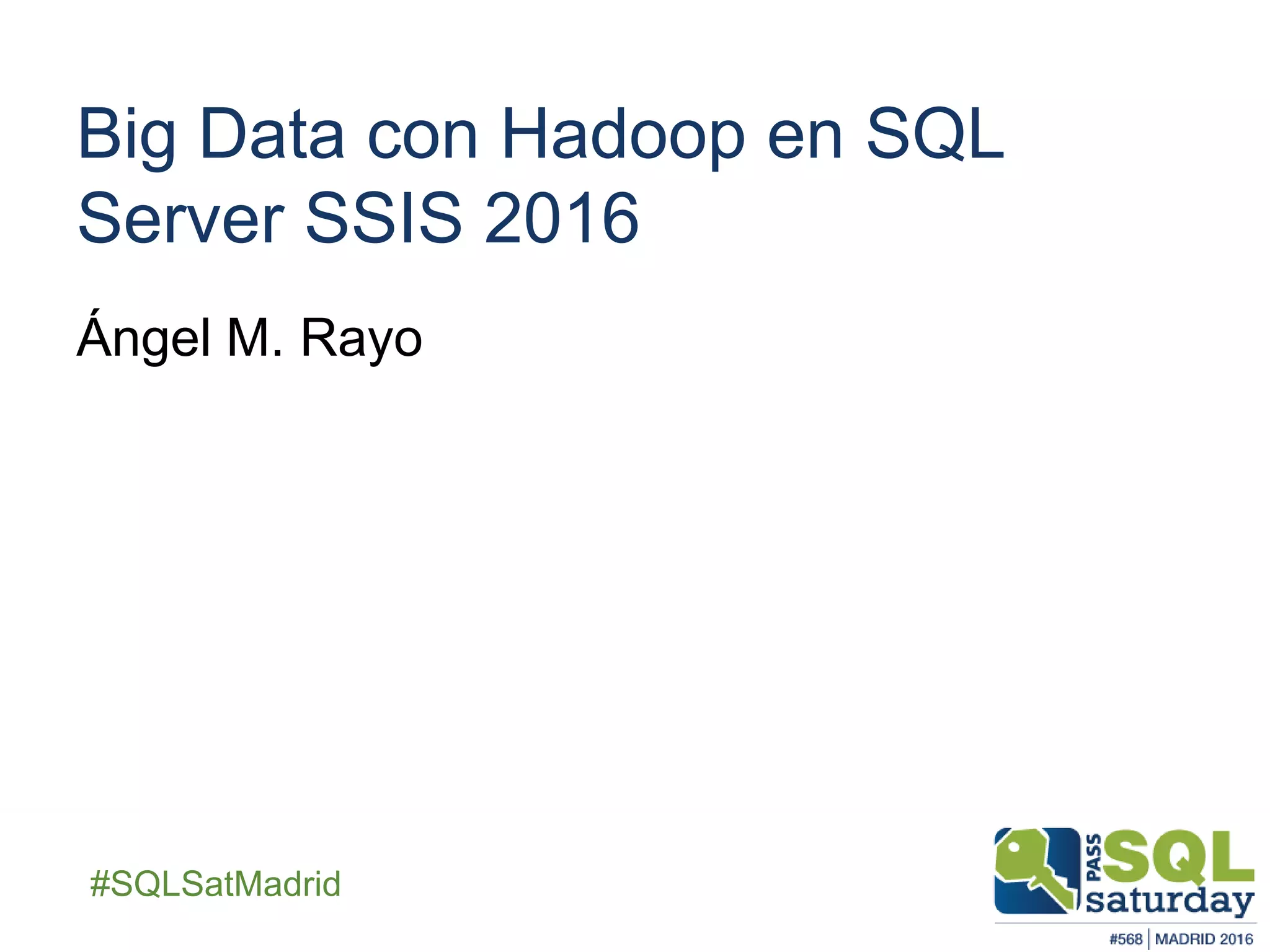 El documento aborda el uso de Hadoop y HDInsight junto con SQL Server Integration Services (SSIS) 2016 para el procesamiento de grandes volúmenes de datos. Se detallan las características y componentes de Hadoop, así como las integraciones posibles con SSIS 2016, que permite la gestión y análisis de datos. Además, se menciona el uso de Azure para la administración de clústeres y la creación de soluciones de Big Data.