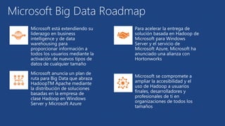 Este documento proporciona una introducción a Big Data y HDInsight. Explica conceptos clave como Hadoop, HDFS, MapReduce, Hive y Pig. También describe las ventajas de HDInsight como una plataforma escalable en la nube para procesar y analizar grandes volúmenes de datos estructurados y no estructurados.
