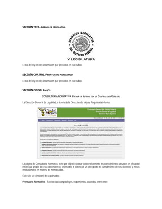 Este documento presenta cinco secciones de información. La primera sección resume una Nota Aclaratoria sobre los Lineamientos para determinar el grado de integración de bienes de importación. La segunda sección indica que no hubo publicaciones relevantes en el Diario Oficial de la Federación. La tercera sección señala que no hay información que presentar sobre la Asamblea Legislativa. Las secciones cuatro y cinco anuncian varios recursos normativos internos nuevos o actualizados de la Contraloría General del Distrito Federal.
