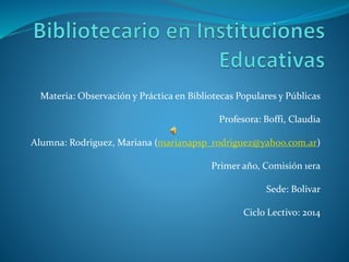 La Biblioteca Popular María Alcira Cabrera, fundada en 1972, se dedica a fomentar la lectura y la cultura en la comunidad de San Carlos de Bolívar. A pesar de tener una colección de aproximadamente 20,500 libros, enfrenta desafíos de infraestructura y financiación, operando con un personal remunerado y sin voluntarios. Actualmente, ofrece préstamos de libros a sus 100 socios y planea iniciar talleres culturales en el futuro.