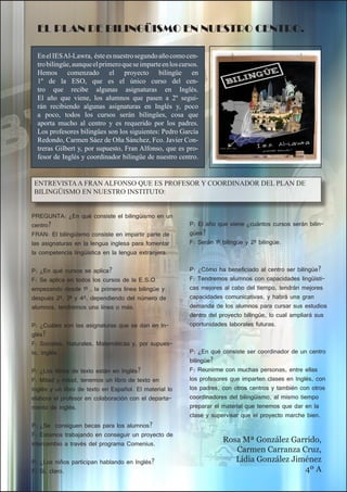 El documento describe el plan de bilingüismo en el IES Al-Lawra. Este es el segundo año que el centro ofrece algunas asignaturas en inglés, empezando por 1o de la ESO. El próximo año, los cursos de 1o y 2o serán bilingües, y gradualmente todos los cursos lo serán. El plan beneficia al centro formando a los estudiantes con mejores habilidades lingüísticas y comunicativas.