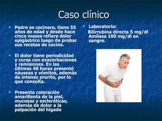 Las dos personas descritas presentan ictericia debido a problemas hepáticos. Mirtha tiene ictericia hepática mientras que Pedro tiene ictericia posthepática. La determinación de bilirrubina directa e indirecta y las enzimas hepáticas ayudan a diagnosticar el tipo de ictericia.