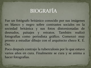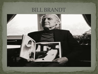 Bill Brandt fue un fotógrafo británico conocido por sus imágenes en blanco y negro que capturaban contrastes sociales en la sociedad británica y sus fotos distorsionadas. Comenzó estudiando dibujo y luego se dedicó a la fotografía después de recuperarse de la tuberculosis. Se interesó en el surrealismo y usó lentes gran angulares para crear desnudos deformados de manera escultórica. Documentó la vida cotidiana y las diferencias sociales en Gran Bretaña en las décadas de 1930 y 1940.