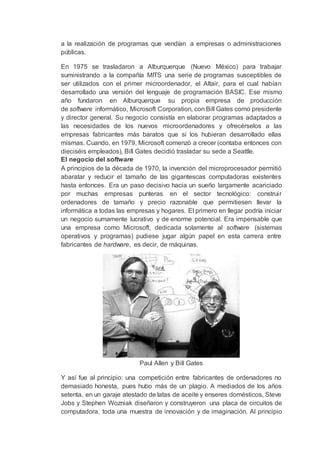Bill Gates (1955) es un empresario estadounidense que fundó Microsoft. Tuvo éxito con el sistema operativo MS-DOS en 1981, que evolucionó a Windows y dominó el mercado de software. Aunque se le critica por prácticas monopolísticas, su contribución popularizó la informática personal. Actualmente es también un filántropo a través de su fundación.