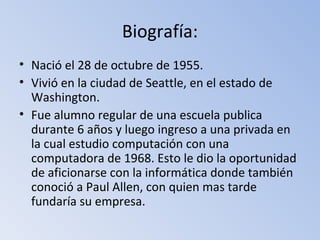 Bill Gates nació en 1955 en Seattle y cofundó Microsoft en 1975 junto a Paul Allen. Originalmente creó Microsoft para comercializar un intérprete de BASIC, y la compañía se convirtió en un gigante del software con sistemas operativos como Windows. Junto a su esposa Melinda, Bill Gates también creó la Fundación Bill y Melinda Gates, la cual se dedica a causas filantrópicas de salud y educación en todo el mundo.
