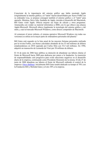 Bill Gates (1955) es un empresario y filántropo estadounidense que cofundó Microsoft en 1975. Microsoft creó el sistema operativo Windows, que se utiliza en la mayoría de computadoras personales en todo el mundo. Gates abandonó la universidad para dedicarse a tiempo completo a Microsoft. En 2008 dejó su cargo en Microsoft para dedicarse a la Fundación Bill y Melinda Gates, dedicada a mejorar la salud y educación global.